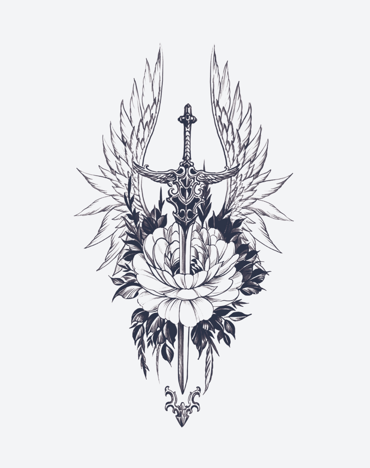 Discover your inner angel with this semi-permanent tattoo of an angel- winged sword piercing through this elegant flower! Each tattoo is 4x7 inches, and lasts up to 14 days, allowing you to explore your identity with no long-term commitment. Are you ready to discover the angel within? Get Angel's Sword today!
