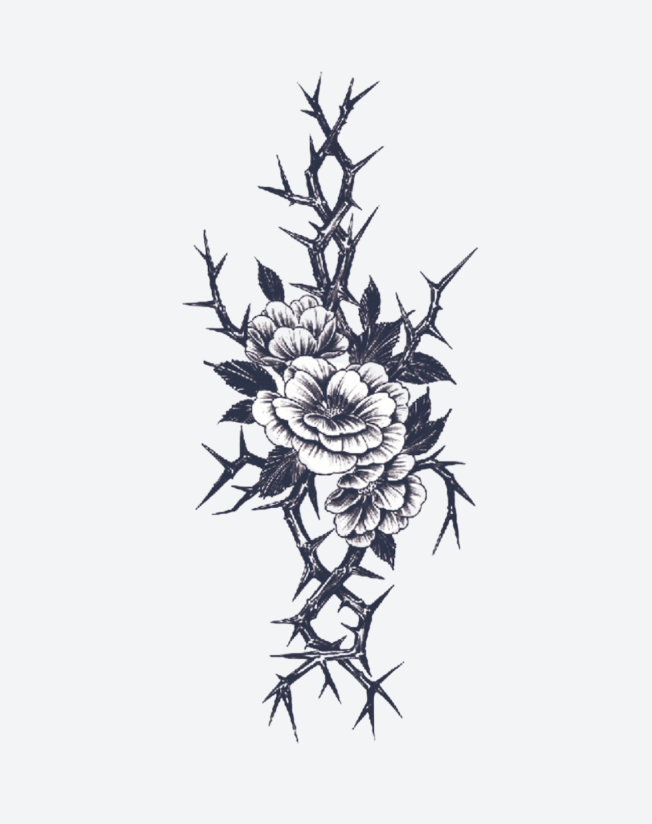 Unleash your inner rebel with our Thorned Flowers temporary tattoo! Measuring 4x7 inches, this realistic floral design is wrapped in edgy thorns. Lasting 1-2 weeks, it naturally fades as your skin regenerates. Bring a touch of toughness and beauty to your look!
