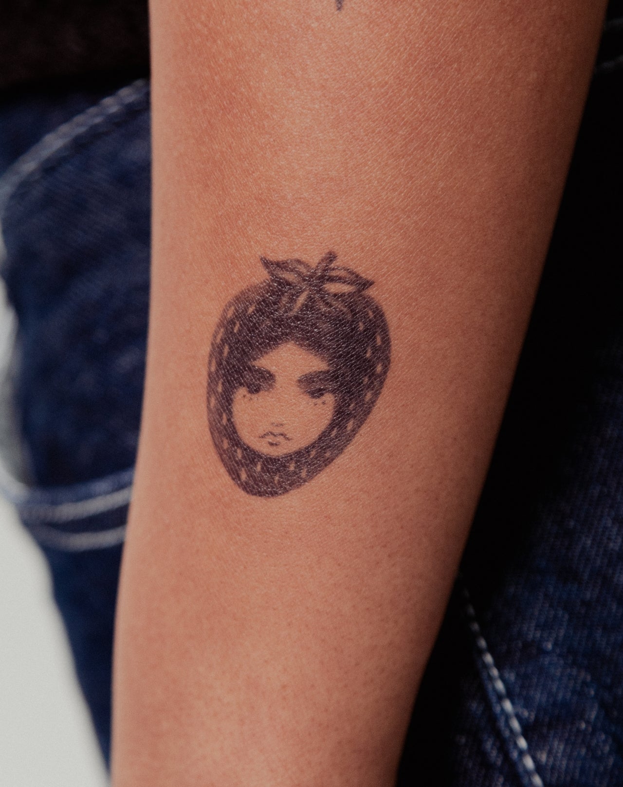 Berry Divine is a surreal 2x2 inch blackwork design featuring a strawberry with a woman’s face on its front, merging sweetness with an eerie twist. Created by @llims.art, this EZINK temporary tattoo lasts 1-2 weeks, offering a playful yet uncanny aesthetic.