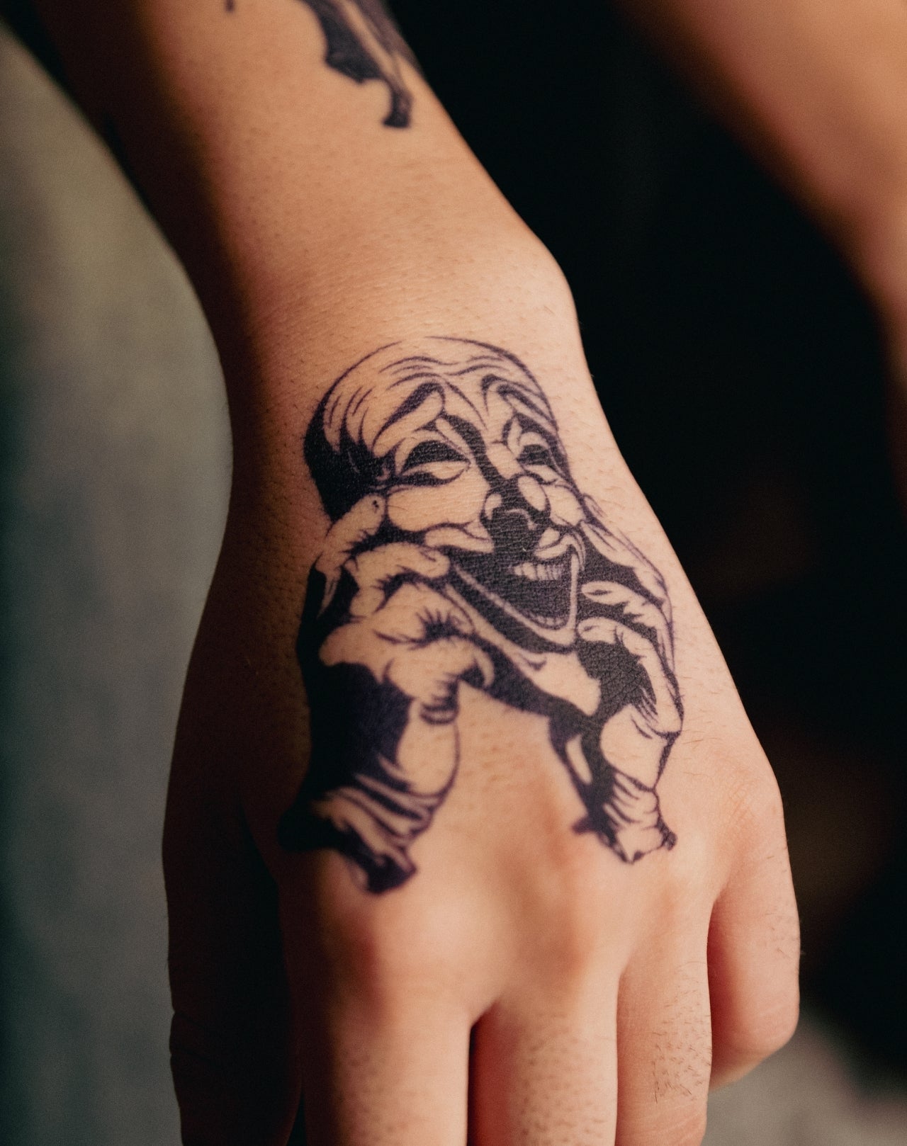 Unleash your inner comedian with our Comedy Mask temporary tattoo! This 4x4 inch EZINK design features two hands holding up a classic comedy mask, created by the talented mahlo_tattoo. Lasting 1-2 weeks, this tattoo lets you show off your funny side without any commitment. Perfect for parties, events, or just adding some humor to your everyday look.