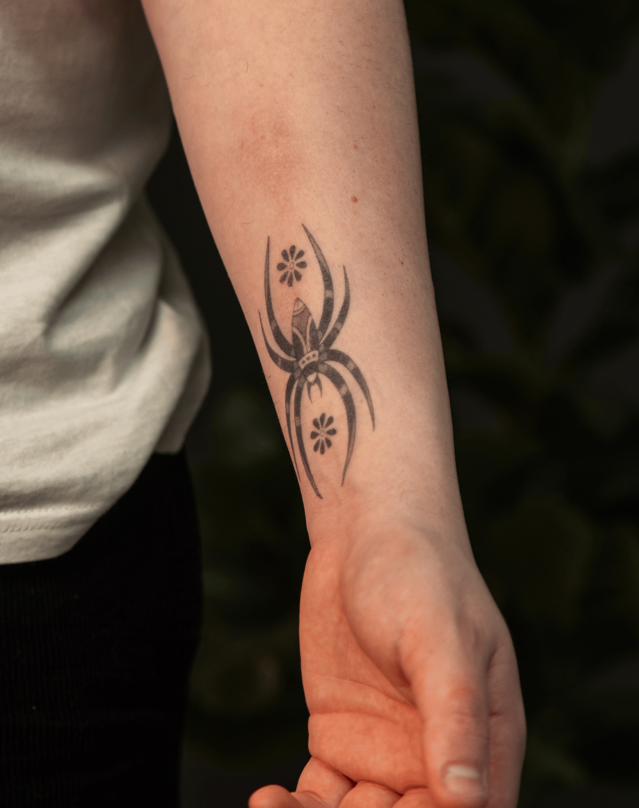 Unleash your inner rebel with our Crawler semi-permanent tattoo! Featuring a bold blackwork spider designed by the renowned artist Wes, this 2x4 tattoo is sure to make a statement. Express yourself and stand out from the crowd with Crawler!