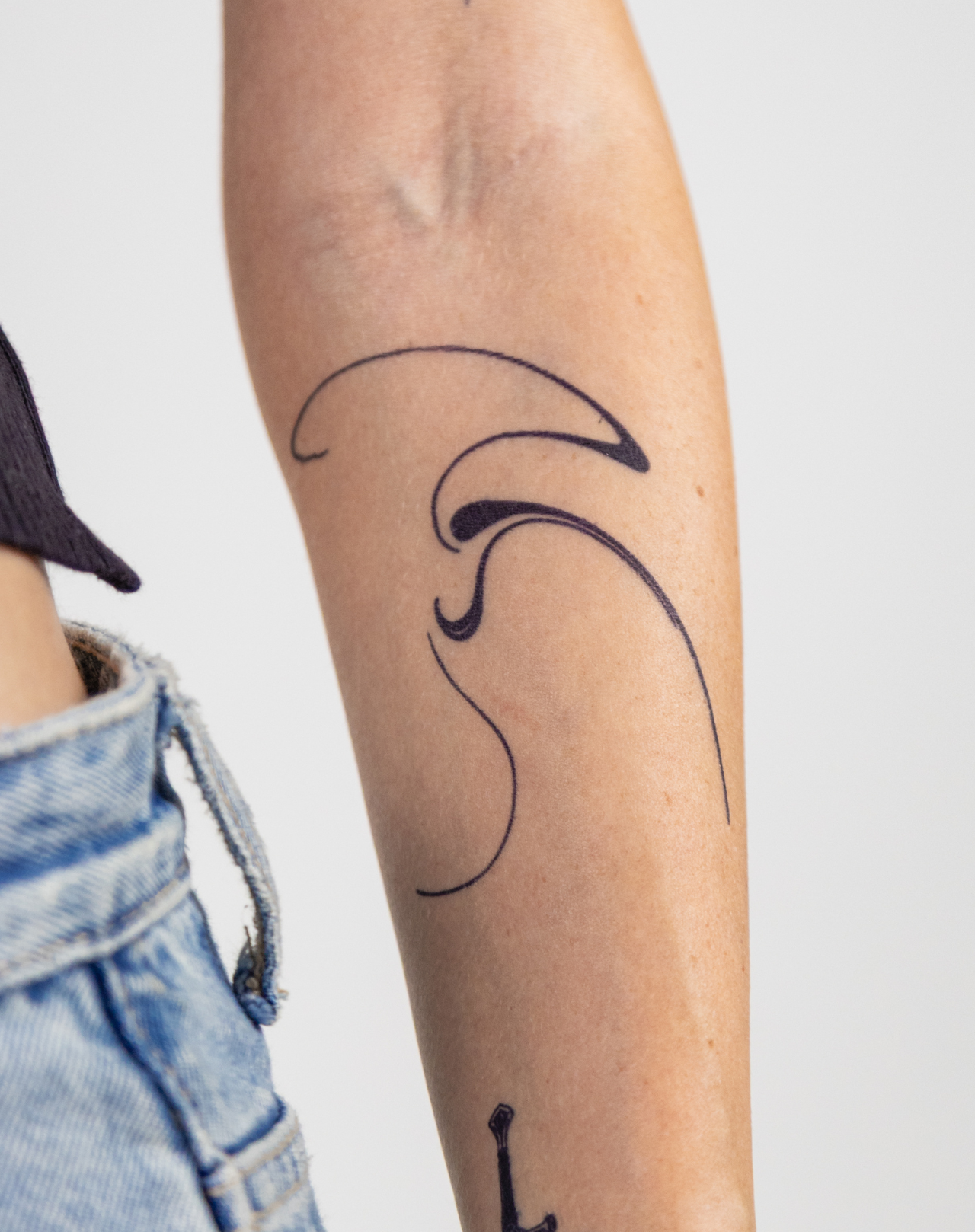 Curl, designed by @nakkabdoesit, is a 4x4 inch EZINK temporary tattoo featuring a sleek and fluid design. With its smooth curves and dynamic form, this piece embodies movement and elegance. Lasting 1-2 weeks, it's perfect for those who appreciate minimalist yet bold artistry.
