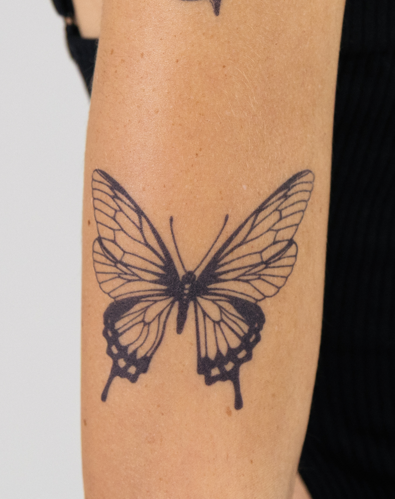 Embrace elegance with the Elysia temporary tattoo, a 4x4 inch design by @loz_tattooer. This beautifully detailed butterfly symbolizes transformation, freedom, and fleeting beauty. Lasting 1-2 weeks, it’s the perfect way to carry a touch of nature’s grace with you.