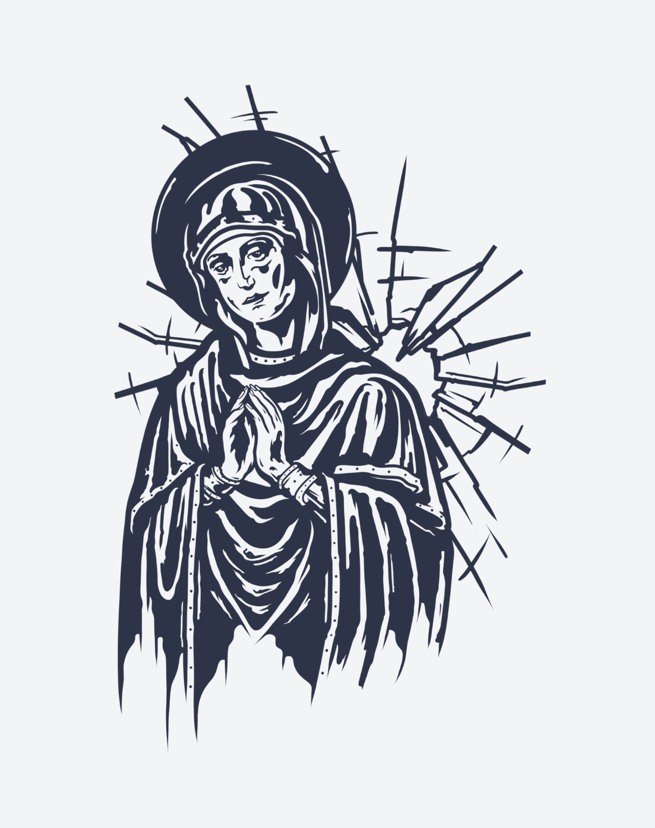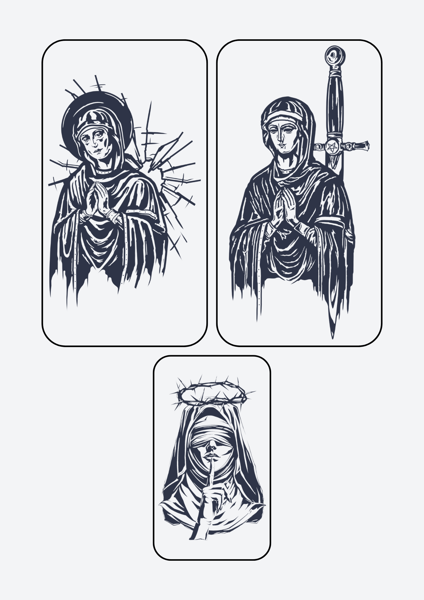 Fallen Divinity is a haunting blackwork set featuring three unique designs: two 4x7 inch tattoos and one 2x3 inch piece. A saint stands solemn with a sword poised behind him, Mother Mary appears with a shattered-glass aura radiating from her back, and a blindfolded nun gazes upward beneath a barbed halo. Created by @vladbaut, these EZINK temporary tattoos last 1–2 weeks, perfect for those drawn to dark iconography, fractured faith, and the beauty found in broken sanctity.