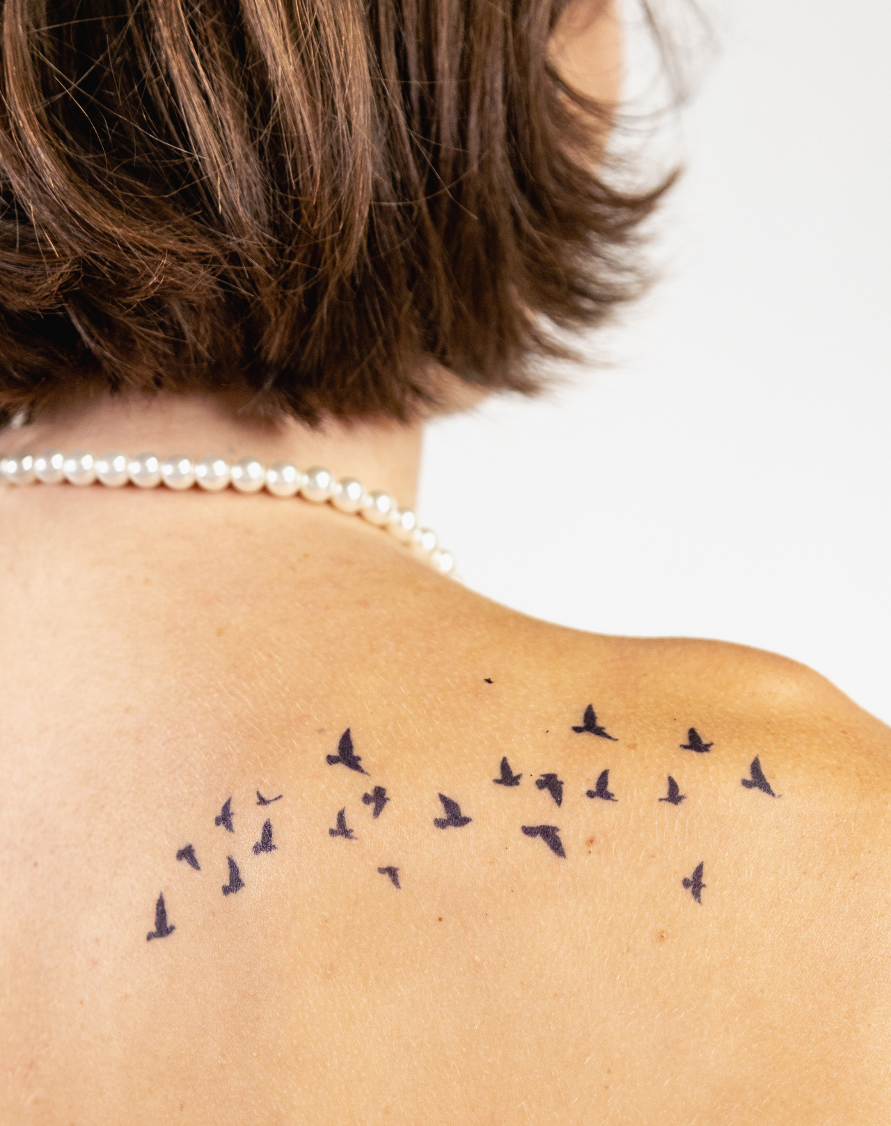 Experience the freedom of flight with our Fluttering Flock temporary tattoo! This captivating 3x6-inch design depicts a flock of birds gracefully flying away, symbolising liberation and movement. Lasts 1-2 weeks, ideal for expressing your love for nature and the open sky before committing to a permanent tattoo.