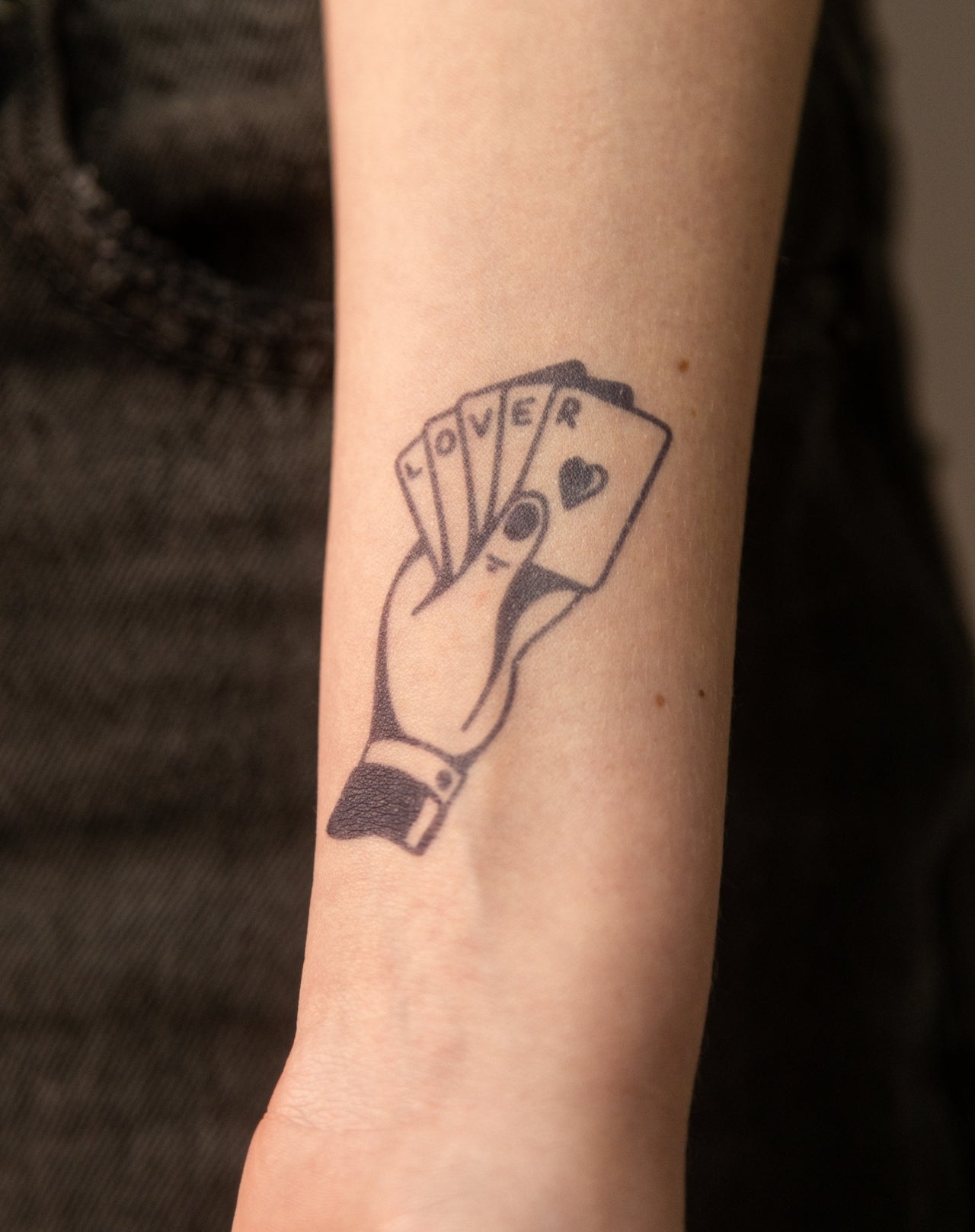 Experience the thrill of a winning hand with Fold 'em, the 2x3 inch EZINK temporary tattoo that lasts 1-2 weeks. Created by tattoo_paine, this design features a hand holding five cards that spell out the word "lover". Show off your love for the game and make a bold statement with this one-of-a-kind tattoo.