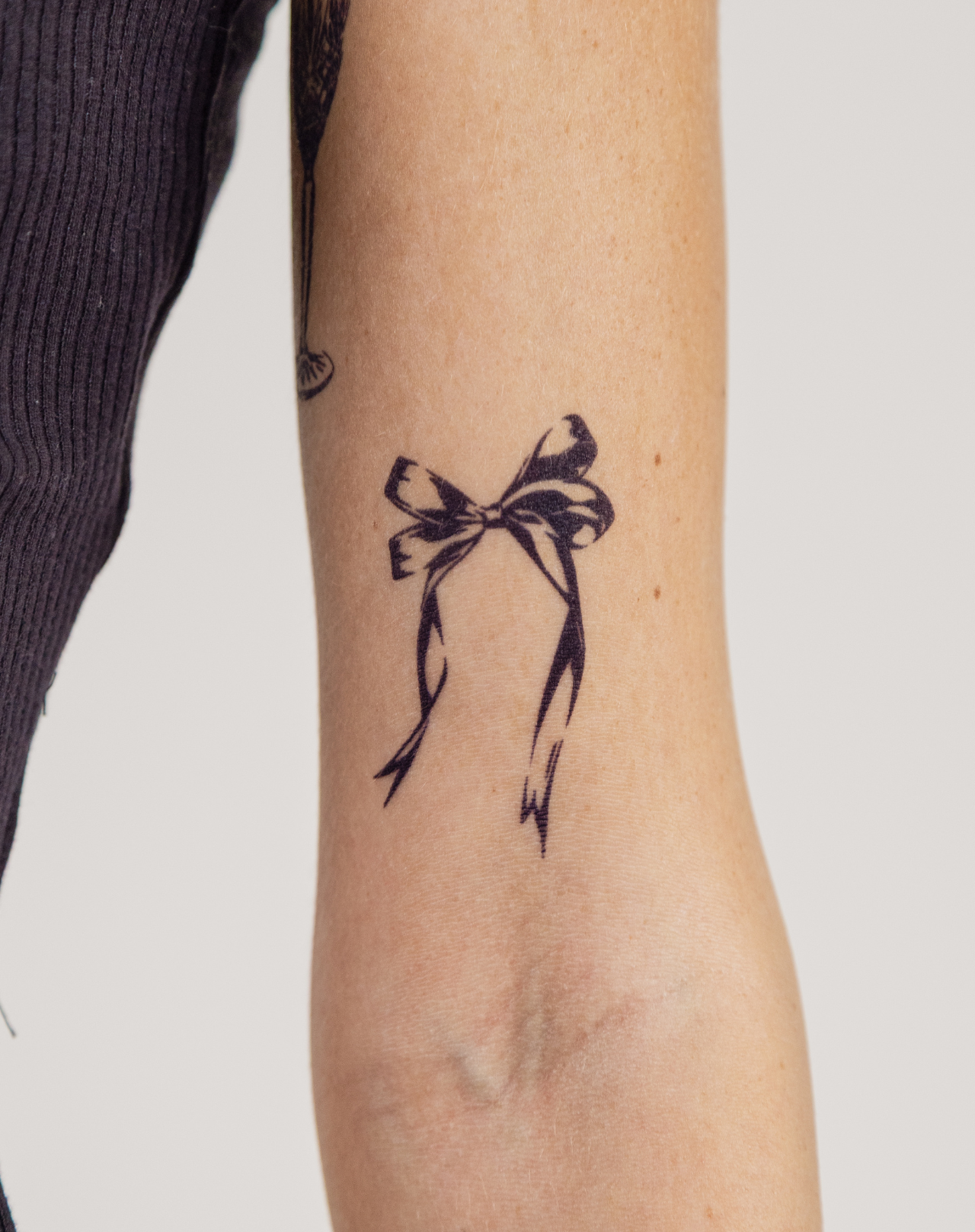 Add a touch of elegance with the Graceful Bow, a 2x3 inch EZINK temporary tattoo that lasts 1-2 weeks. Featuring a stunning blackwork bow design by mahlo_tattoo, it's the perfect accessory for any occasion. Express your unique style and stand out from the crowd with this beautiful and long-lasting tattoo.
