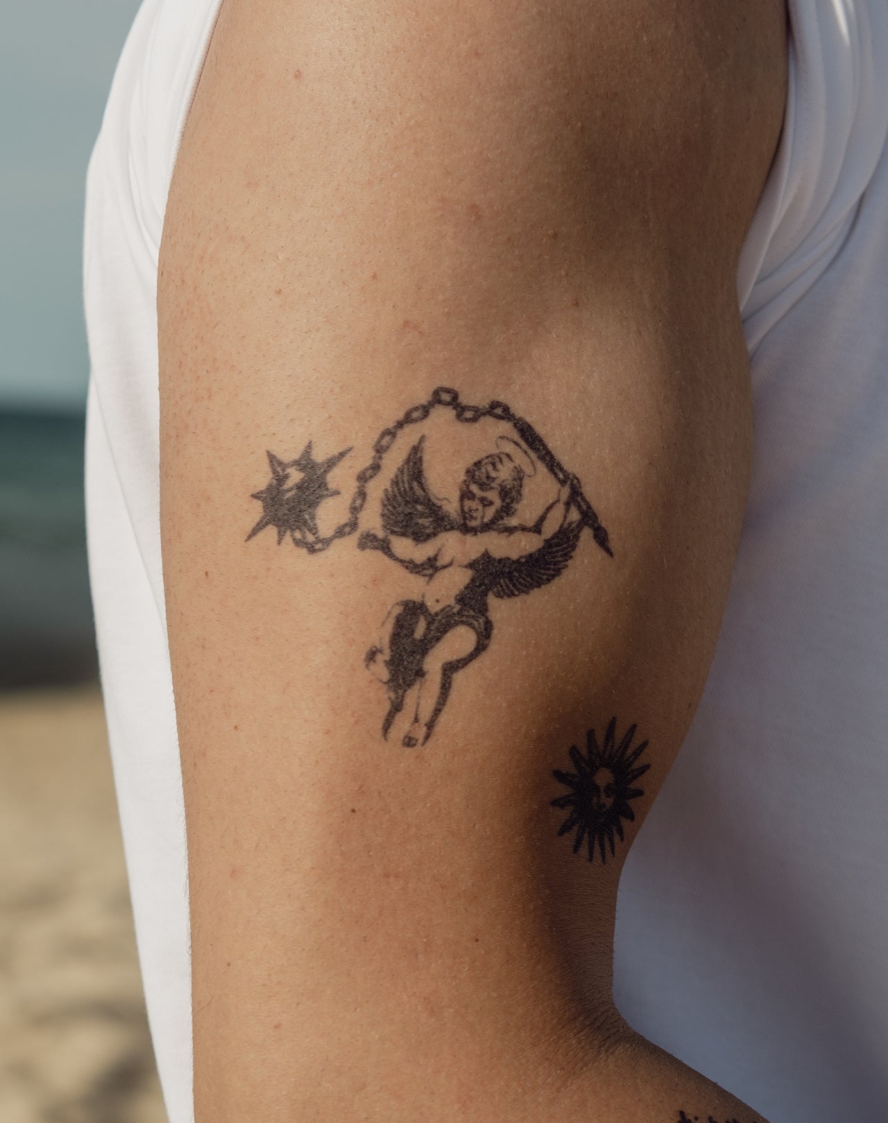 Embrace divine reckoning with the Halo Reaper temporary tattoo, a 4x4 inch design by @loz_tattooer. Featuring a cherub clutching a flail, this piece blends innocence with power, symbolizing fate, justice, and the balance between light and dark. Lasting 1-2 weeks, it’s a striking reminder that even angels have an edge.