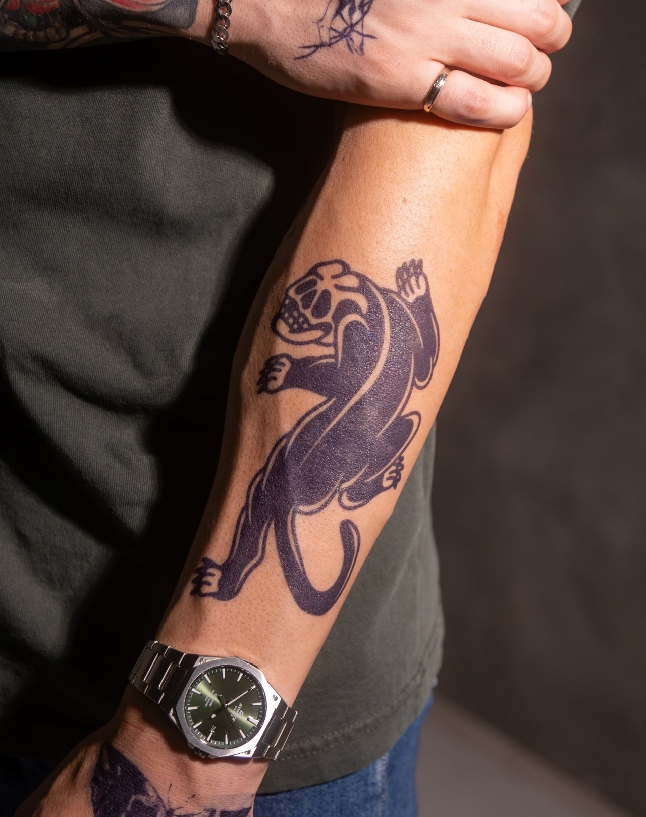 Unleash your wild side with Hells Feline! This 4x7 inch EZINK temporary tattoo, designed by tattoo_paine, features a bold blackwork panther with a skull for a head. Lasting 1-2 weeks, it's the perfect way to show your love for fierce and fearless felines.