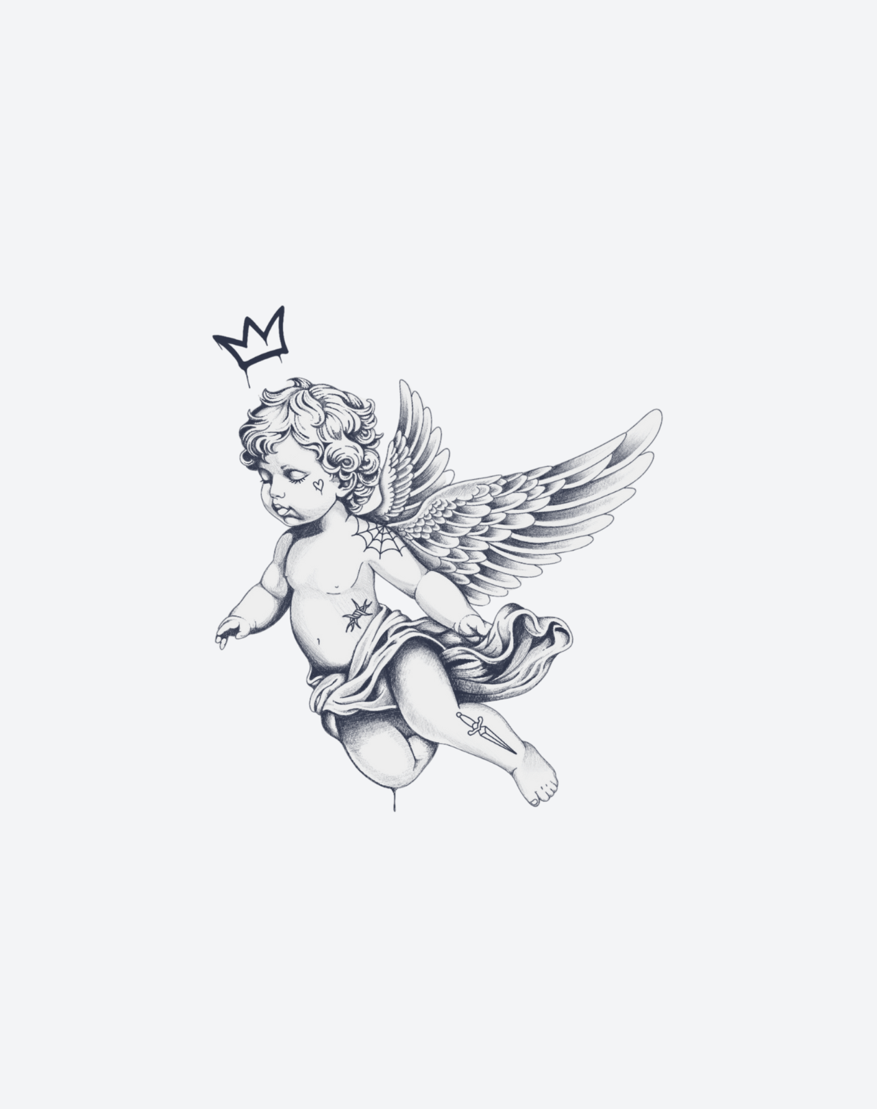Inked Innocence is a 4x4 inch design by @brooketattoos, reimagining the classic cherub with a rebellious twist. Crowned above and detailed with miniature tattoos — from a heart and web to a tiny blade — this winged figure blends purity with edge. The 1–2 week EZINK temporary tattoo plays on the tension between innocence and defiance, making it a striking emblem for those who embrace contrasts and rewrite tradition in their own style.