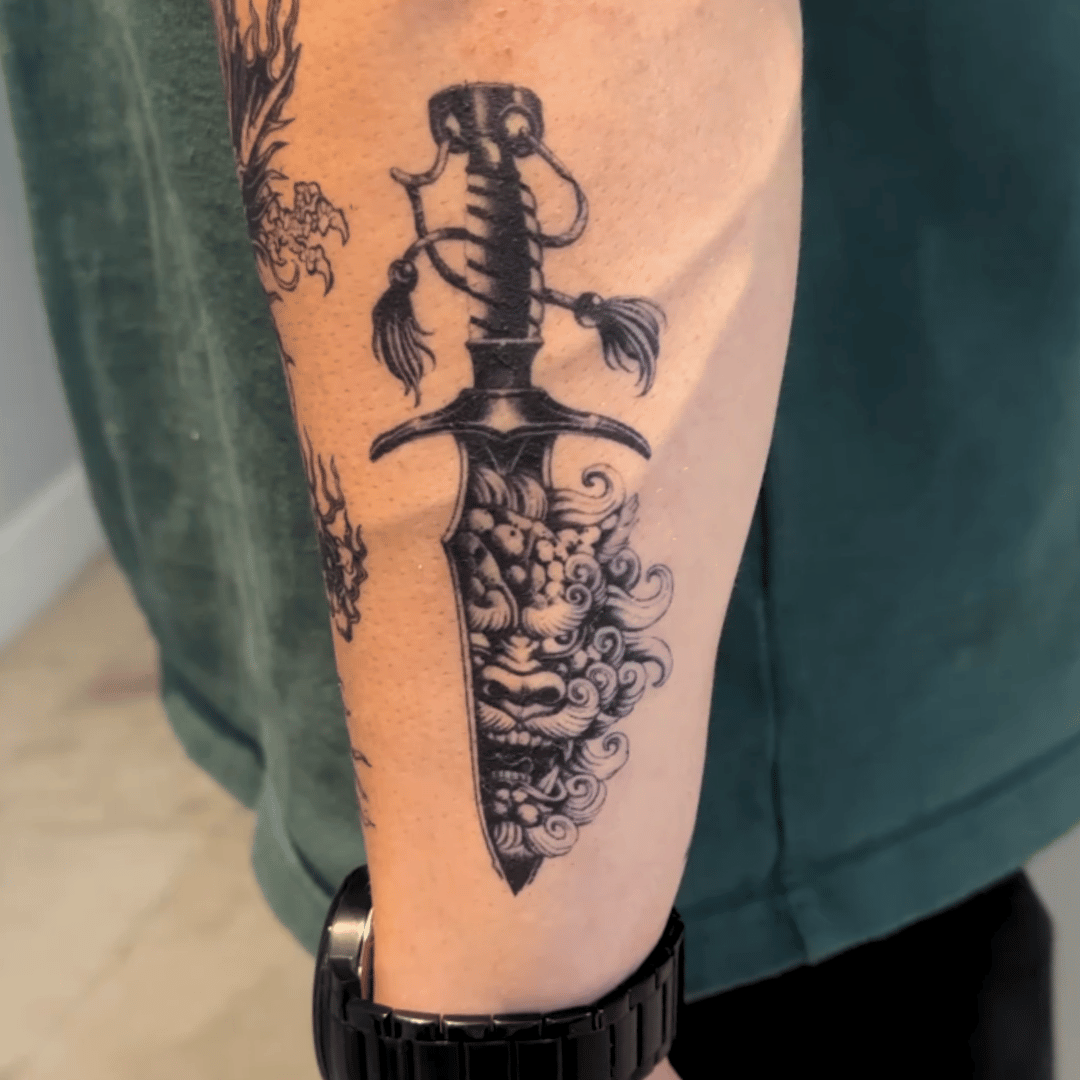 Experience the artistry and craftsmanship of Japanese daggers with this 3x6" semi-permanent tattoo. Enjoy up to two weeks of eye-catching body art without the commitment of permanent ink. Experiment with different styles and placements in a fun and affordable way.