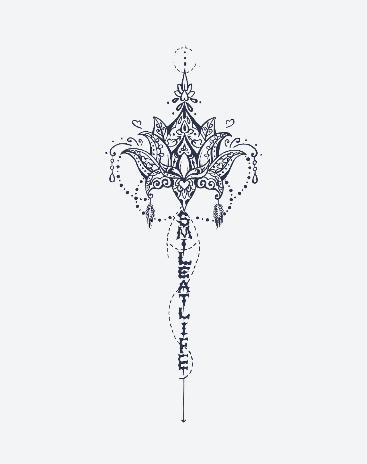 Get inspired with our Lotus Mandala semi-permanent tattoo that lasts for 2 weeks! This beautiful 4x7 inch design features the quote "smile at life," reminding you to embrace positivity and joy. Add a touch of elegance to your look and embrace the power of a smile with Lotus Mandala.