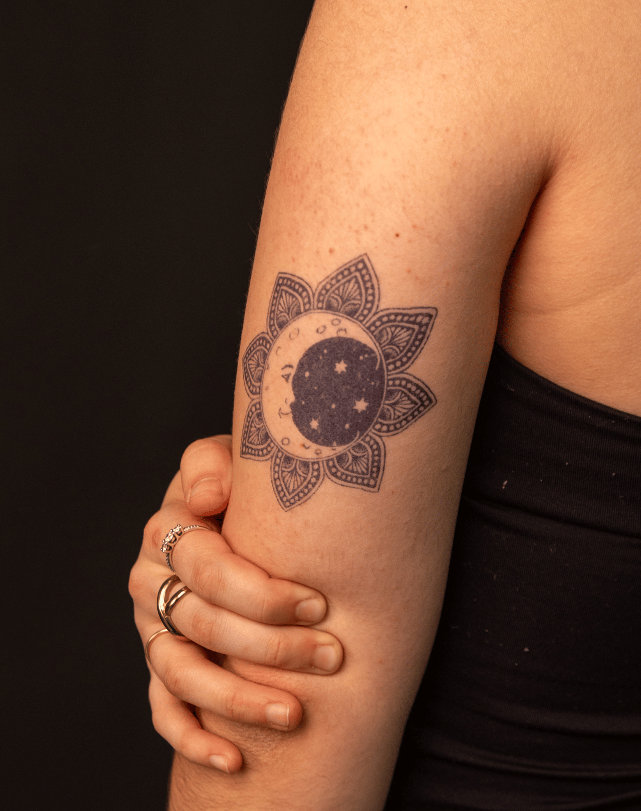 Experience stunning artwork with Moongazing temporary tattoo by Robbie Cook! Measuring 4x4 inches, this tattoo lasts 1-2 weeks and mimics a real tattoo. Follow artist @rob.c.art on Instagram for more of his amazing designs. Let your skin be a canvas for this beautiful and unique piece of art.