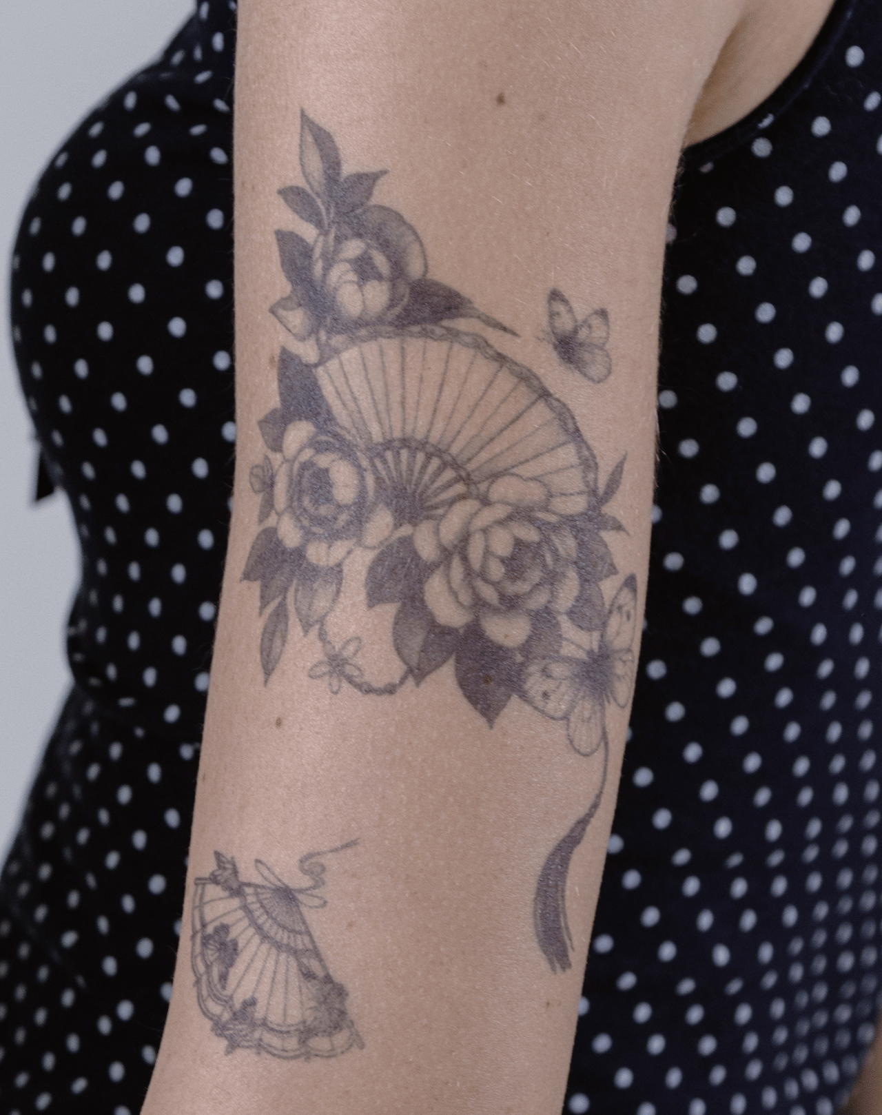 Peony Whispers is a 4x7 inch design by @caitlynjtattoo featuring an elegant composition of blooming peonies, delicate butterflies, and a fan adorned with intricate details. The soft shading and fluid lines evoke a sense of grace and tranquility, capturing the timeless beauty of nature in its most refined form. This design speaks to those who appreciate intricate florals and subtle femininity. Delivered as a 1–2 week EZINK temporary tattoo.