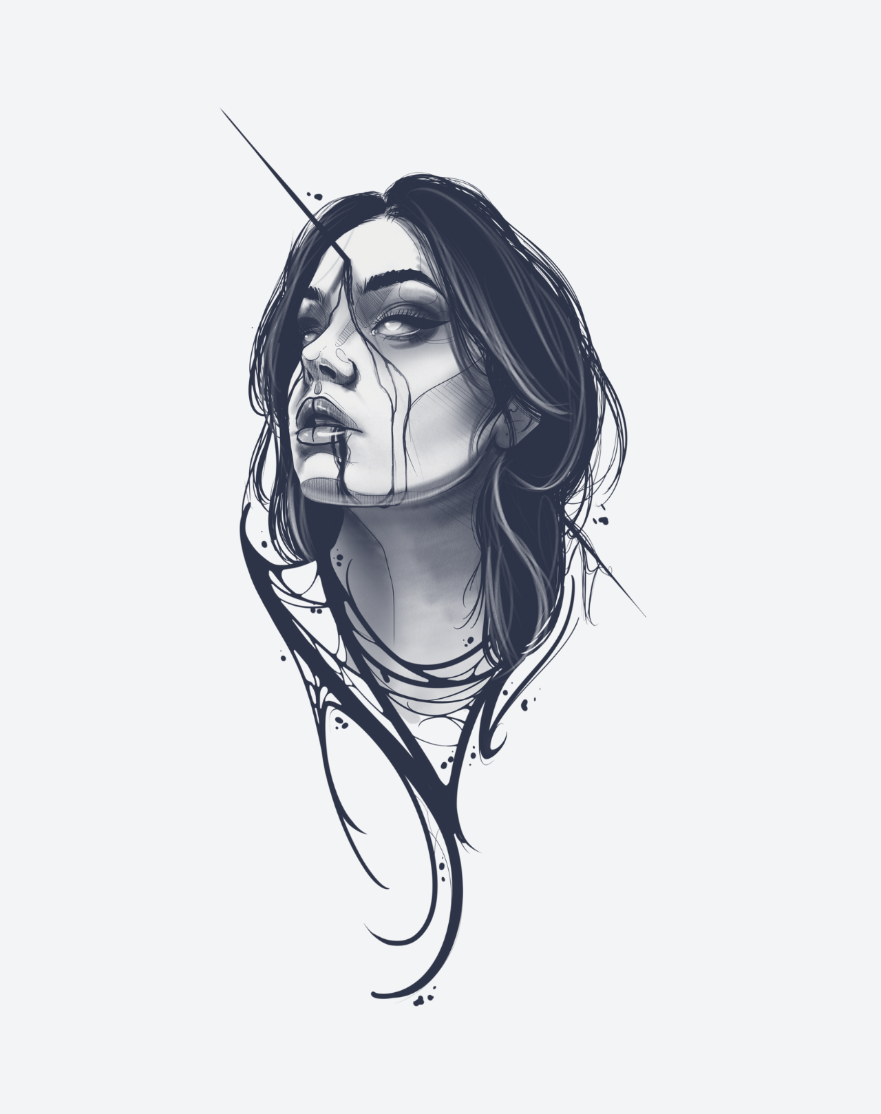 Pinprick is a 4x7 inch design by @kirsten.tattoo that merges vulnerability and defiance in a striking portrait. A poised woman gazes upward, fractured by fine lines and pierced through by an angular shard, as inky motifs swirl around her neckline. The piece captures the tension between elegance and rupture—ideal for those who find strength in their scars. Delivered as a 1–2 week EZINK temporary tattoo.