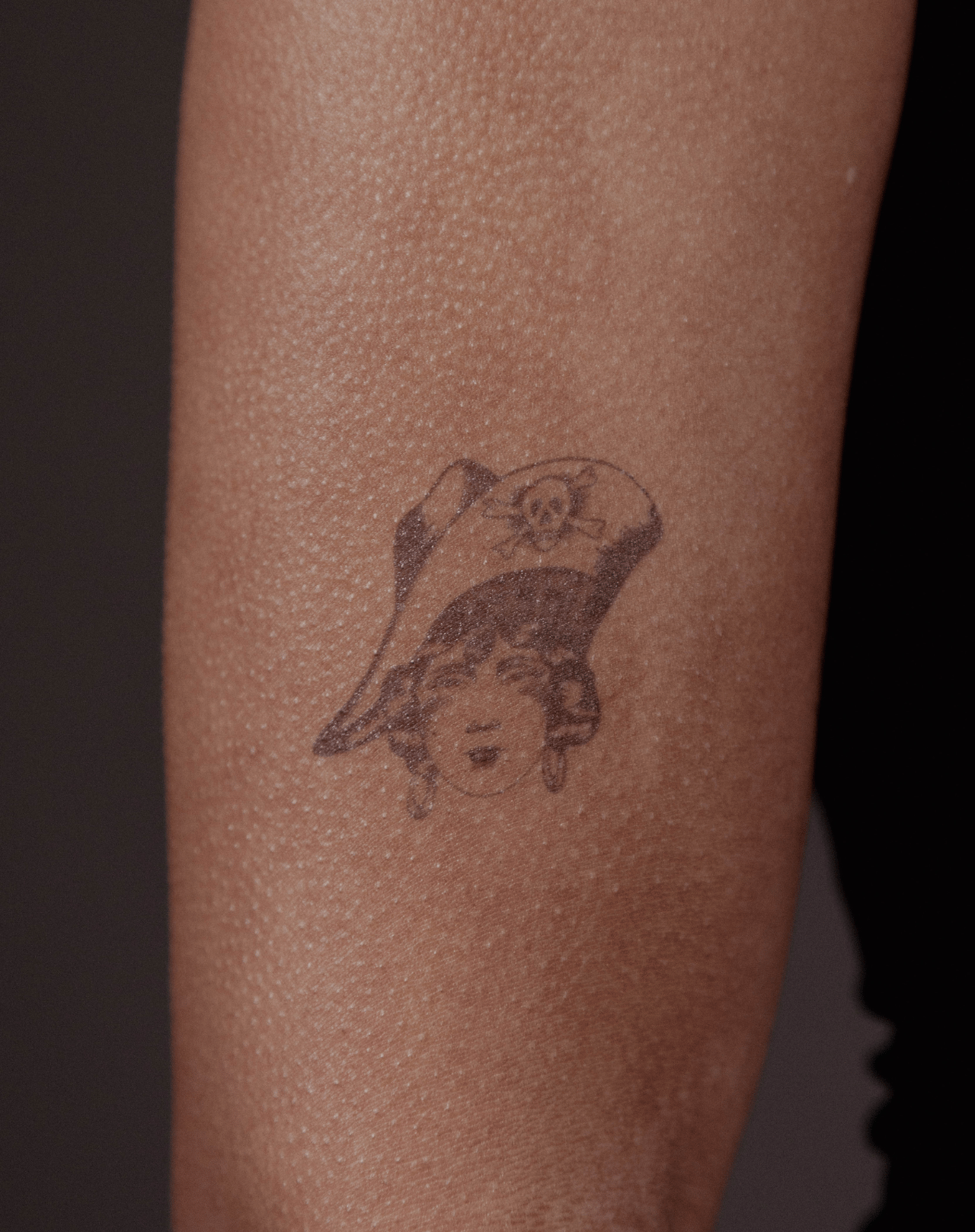 Pirates Lady is a bold 2x3 inch design featuring the commanding visage of a vintage pirate woman, eyes steeled with poise and mystery. Her iconic hat, adorned with a classic skull and crossbones, and her hoop earrings nod to timeless nautical lore. Illustrated with sharp contrast and traditional Americana flair, this piece channels strength, independence, and the spirit of untamed adventure. Designed by @aaronfhc, this EZINK temporary tattoo lasts 1–2 weeks—perfect for those who carry rebellion in their heart and the sea in their soul.