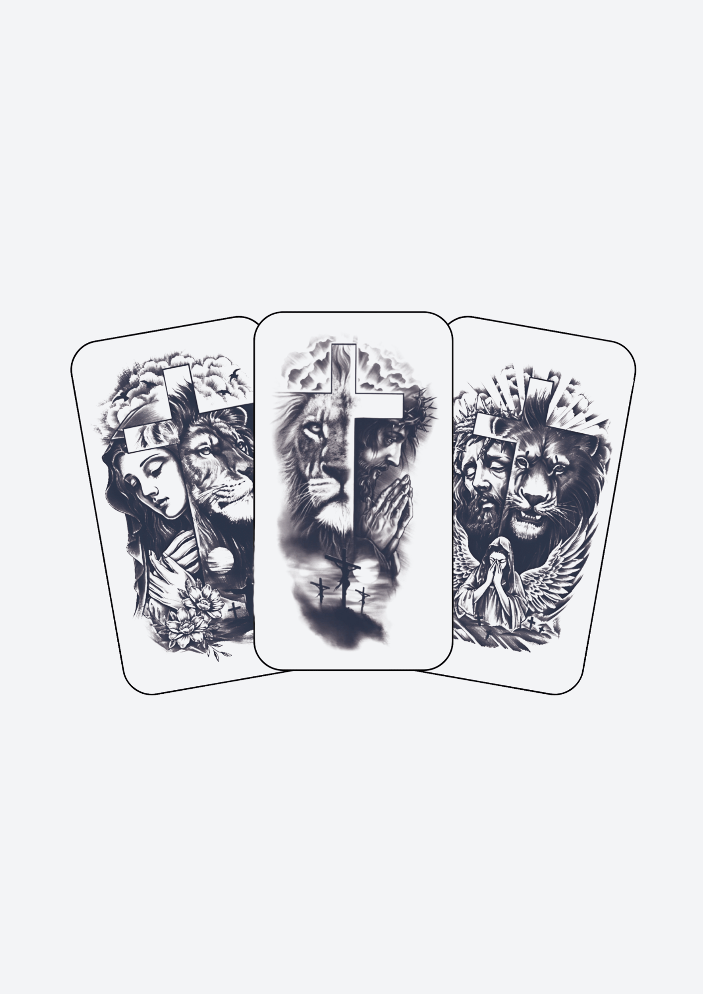 Unleash your inner strength and faith with our Religious Realism Lion Pack! This EZINK Tattoo pack includes three stunning and incredibly lifelike lion designs, each measuring 4x7. Let these powerful symbols of courage, protection, and spirituality adorn your skin and inspire you every day.