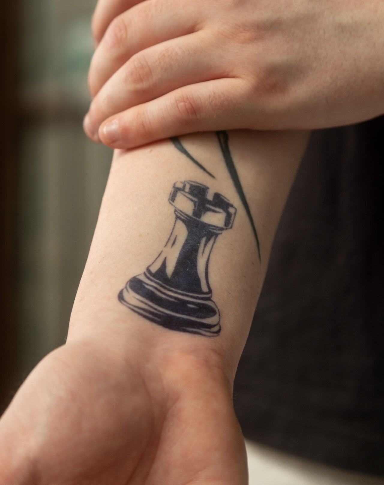 Transform yourself into a work of art with Rook, the 2x3 inch EZINK temporary tattoo that lasts 1-2 weeks. Designed by mahlo_tattoo, this intricate rook chess piece design will make a bold statement and add a touch of sophistication to any outfit. Make a lasting impression with Rook.