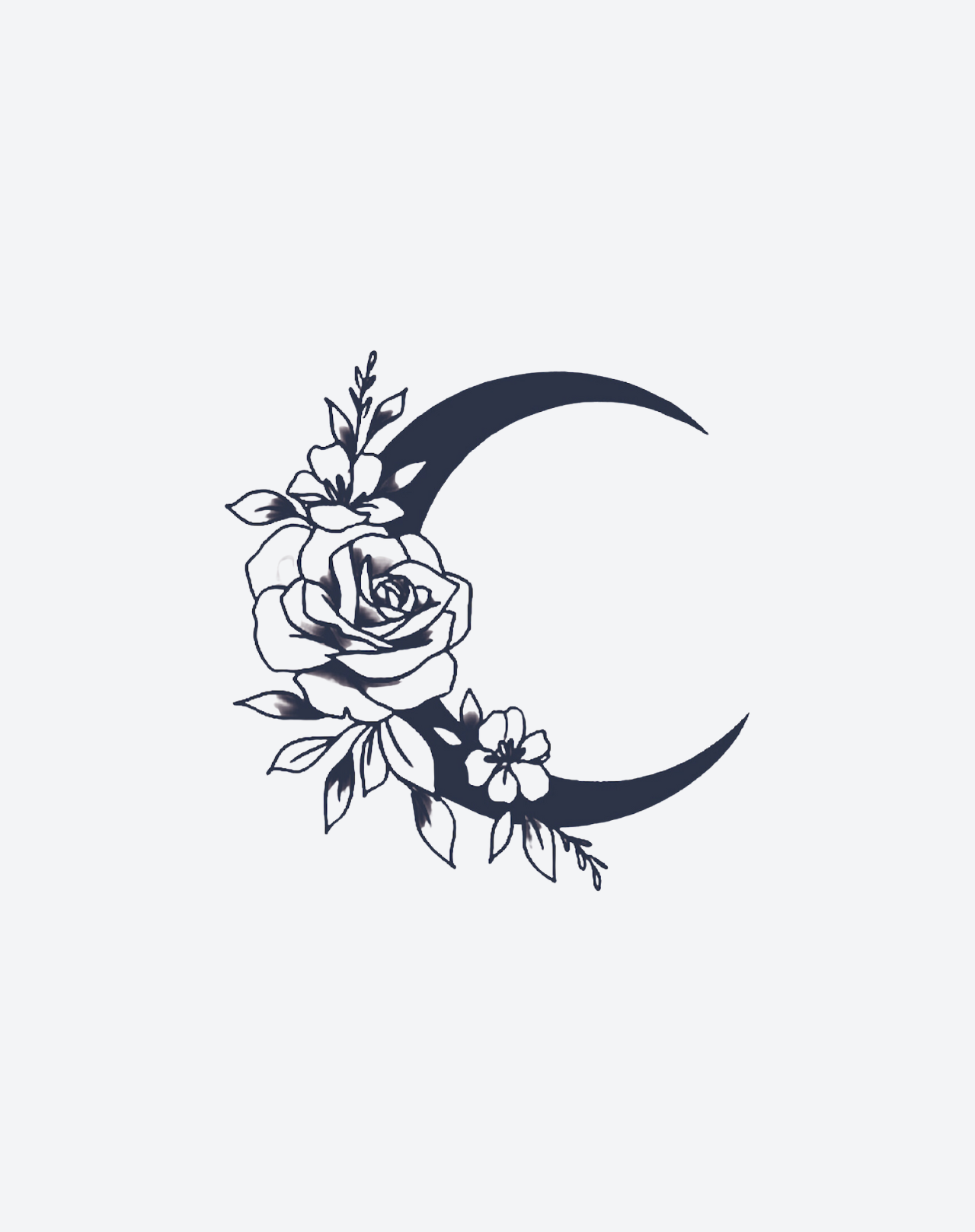 Capture celestial beauty with our Rose Crescent temporary tattoo! This enchanting 2x2-inch design features a crescent moon adorned with small flowers and a delicate rose, symbolising romance and mystique. Lasts 1-2 weeks, perfect for testing your dreamy and artistic style before committing to a permanent tattoo.