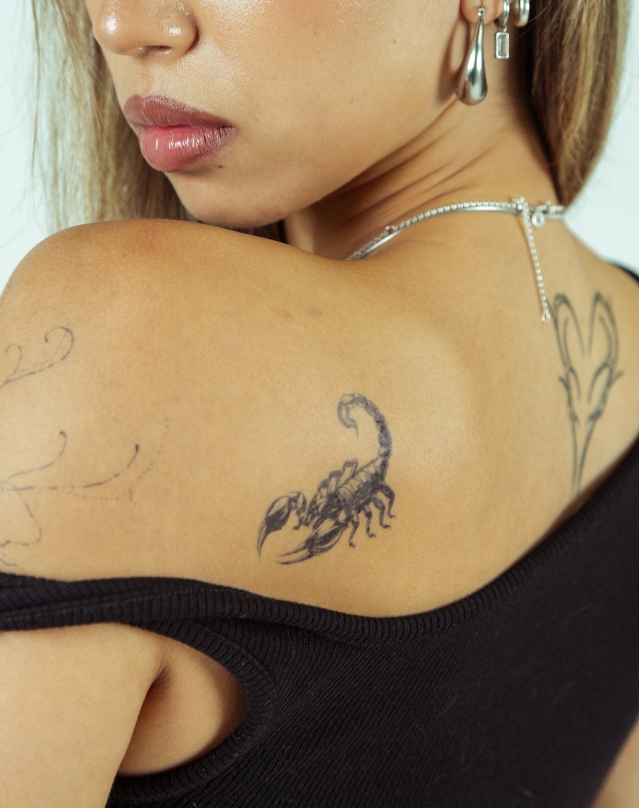 Experience the ultimate power of self-expression with Stinger temporary tattoo! Measuring 2x3 inches, this EZINK tattoo features a unique blackwork scorpion design by mahlo_tattoo. Stand out with this long-lasting tattoo that's sure to turn heads for 1-2 weeks. Make a bold statement without the commitment of permanent ink.