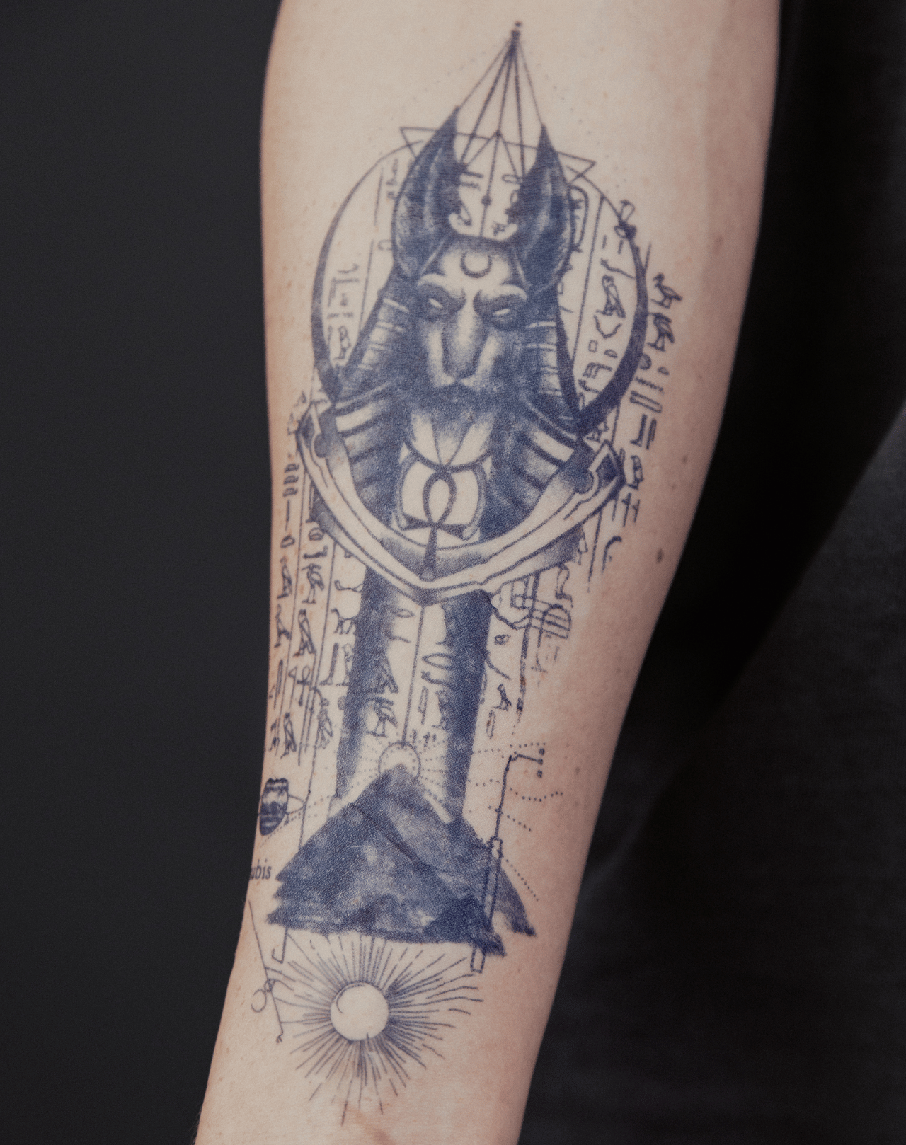 Temple Moon is a mystical 5.5x9 inch design channeling ancient Egyptian symbolism through layered detail and celestial geometry. Centered on Anubis beneath a crescent moon, the design unfolds with sacred script, pyramids, and planetary alignments—bridging earthly ritual and cosmic order. Created by @ivy_tattooist, this EZINK temporary tattoo lasts 1–2 weeks, perfect for those drawn to divine guardianship, lunar energy, and the wisdom of old worlds.