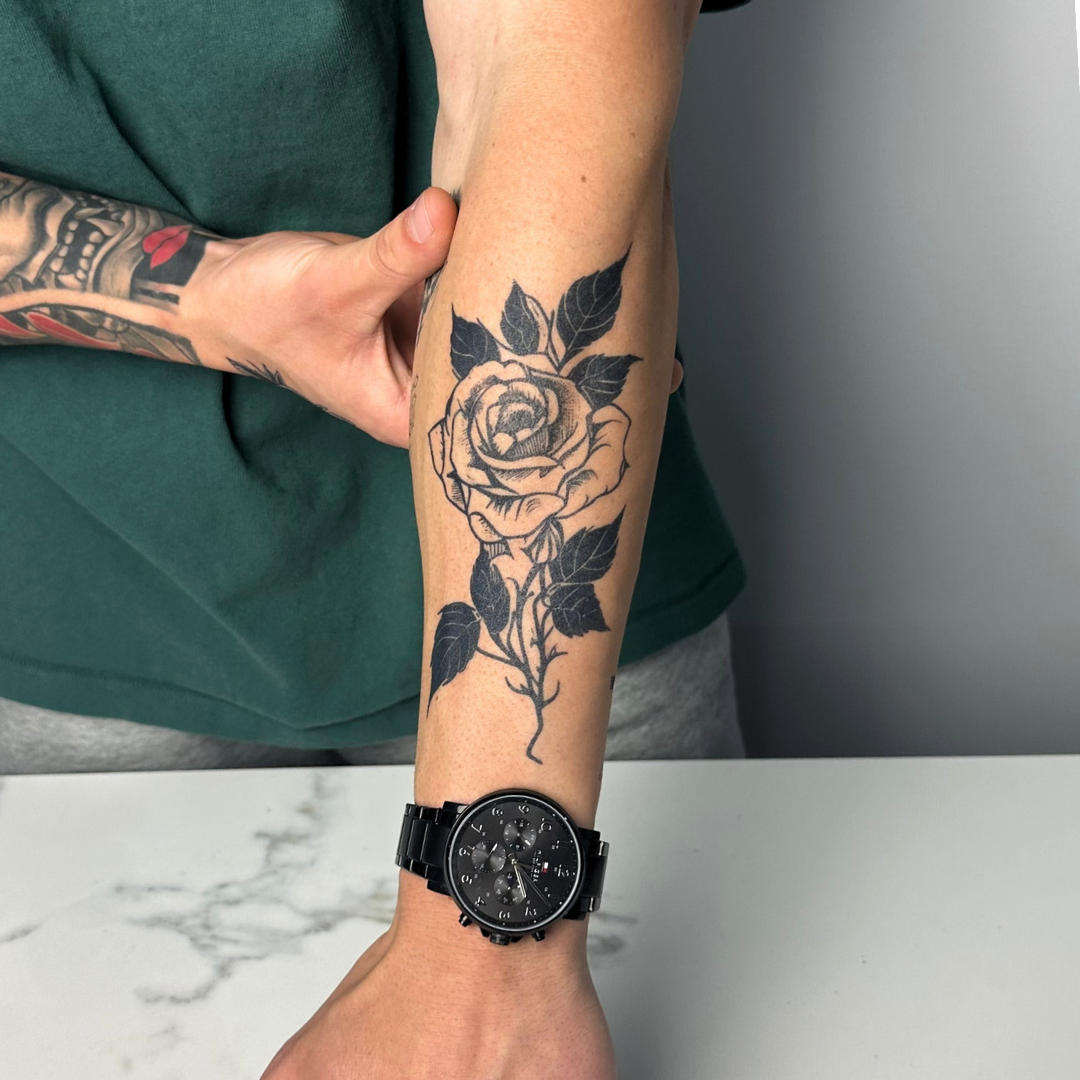 Embrace your daring side with the Thorned Rose! This 4x7" semi-permanent tattoo lets you explore fun and unique tattoo styles without the commitment of an inking - all for an affordable price! Its black hue and rose design brings an edgy flair for up to two weeks, making it a great choice to express yourself in the perfect temporary way.