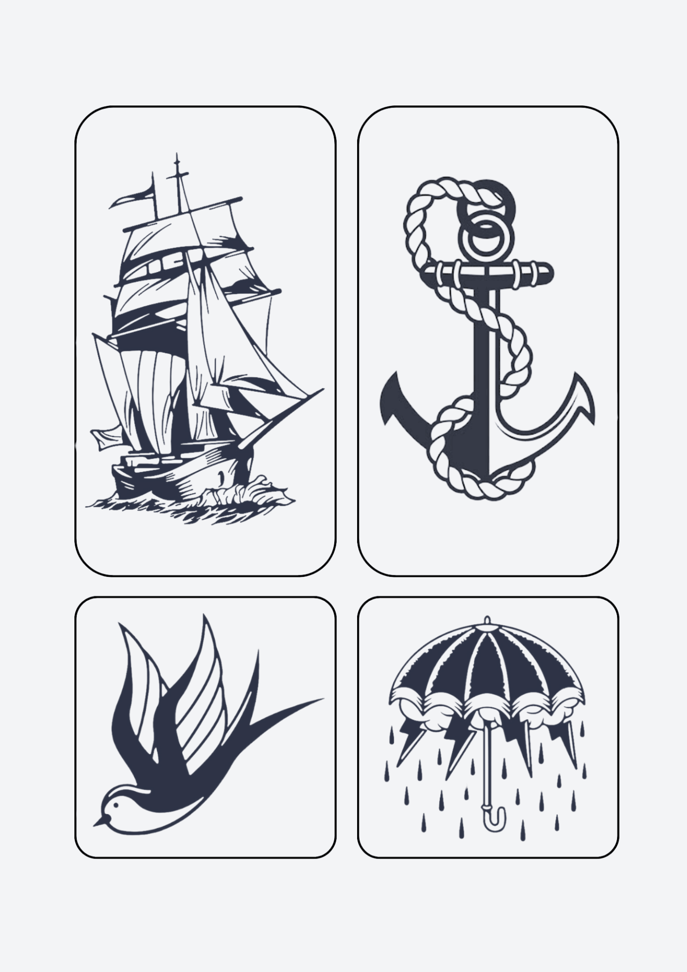 Experience the beauty of traditional sailor tattoos with the EZINK Traditional Sailor Pack! Perfect for anyone looking to start a patchwork sleeve, this kit includes 2 4x4 inch tattoos and 2 4x7 inch tattoos that last 1-2 weeks. Express your love for the ocean and stand out with these stunning designs.