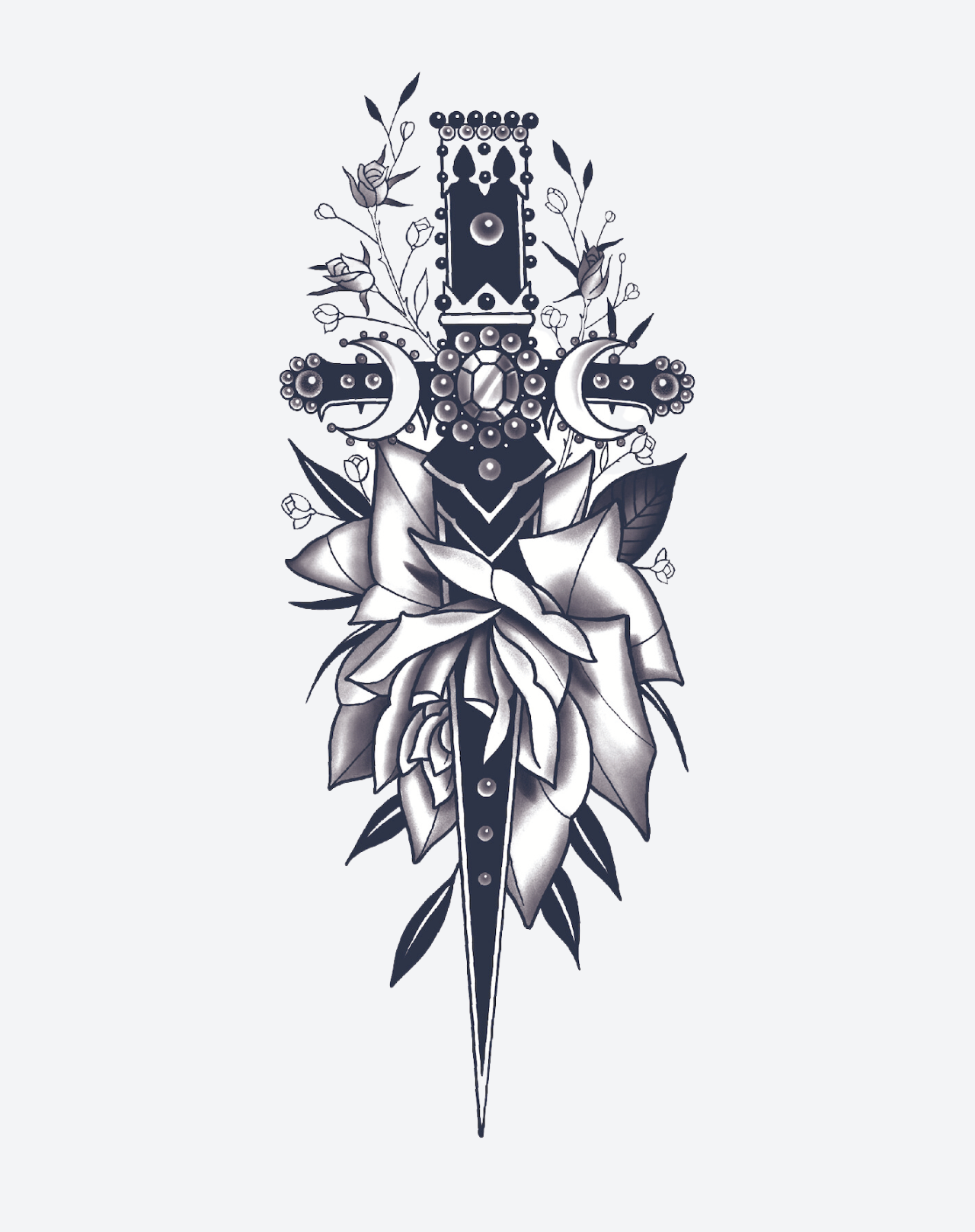Embrace elegance with an edge with our Jeweled Dagger temporary tattoo! This 4x7-inch design features a realistic jeweled dagger piercing through a delicate rose, symbolizing beauty and strength. Lasts 1-2 weeks, perfect for testing your bold and sophisticated style before committing to a permanent tattoo.